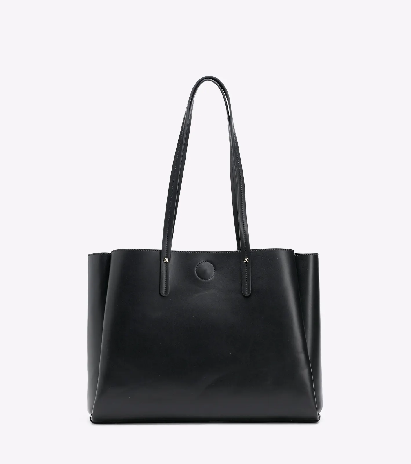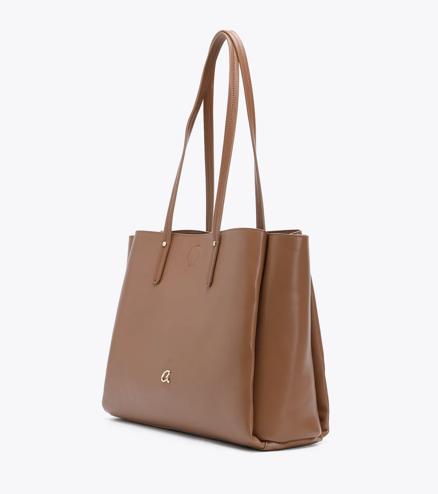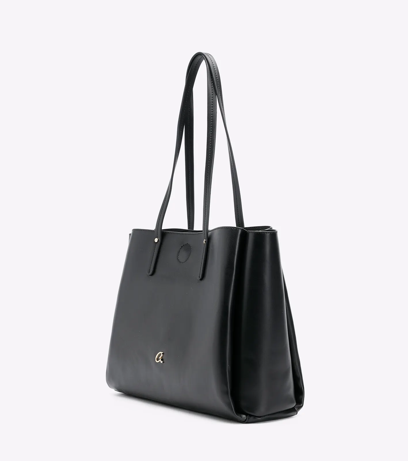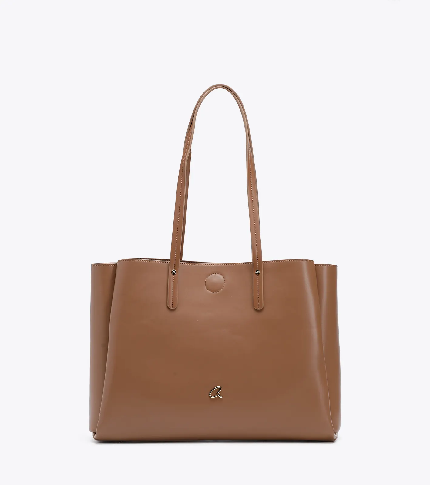 Shopping bag con doppio manico dallo stile minimal e una texture liscia, caratterizzata dal logo nella parte frontale.