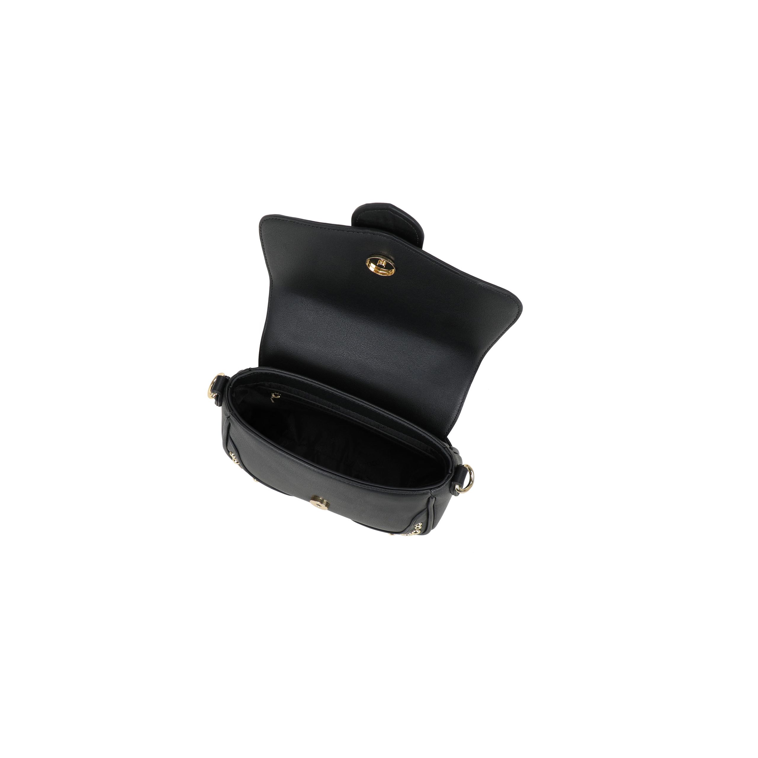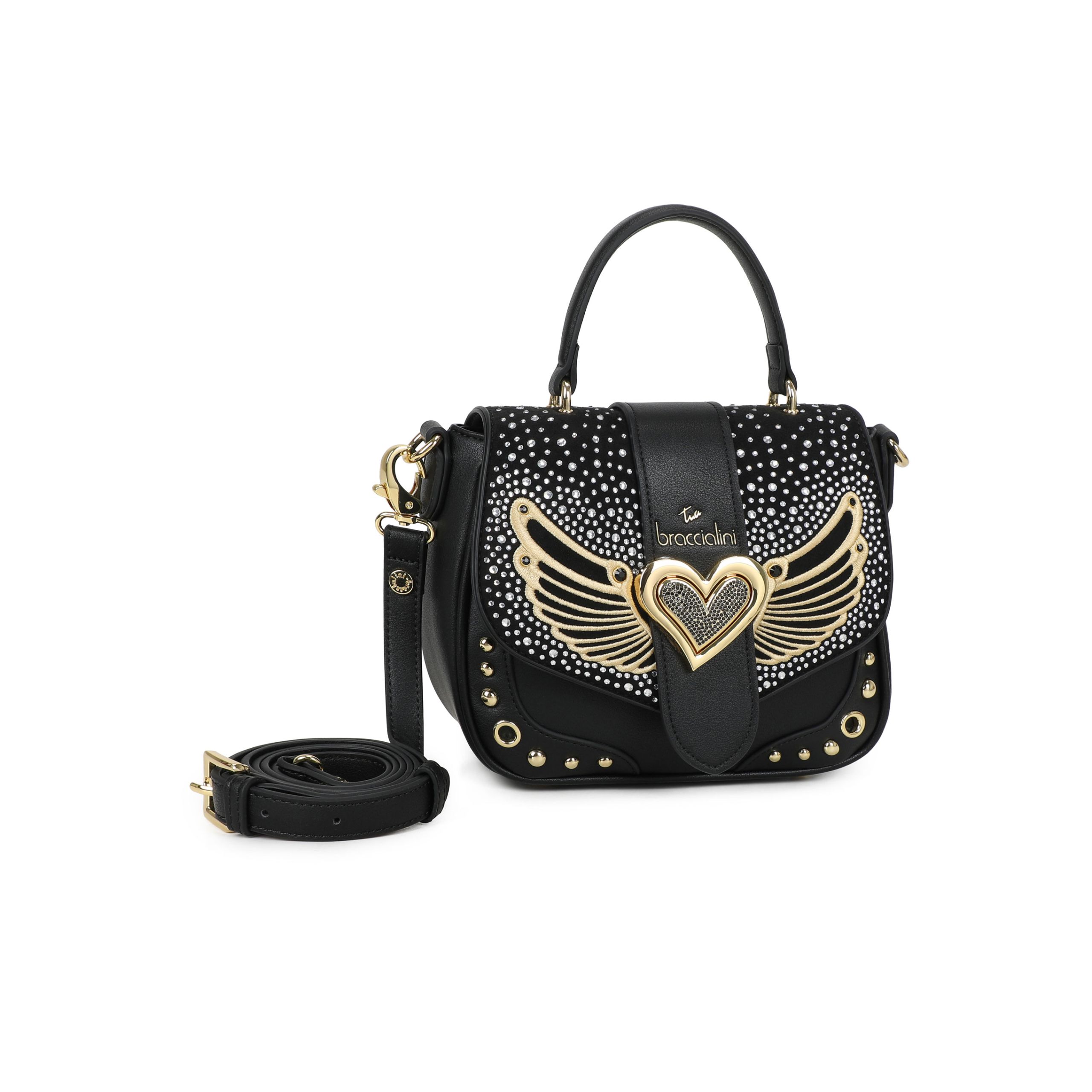 Borsa a mano di piccole dimensioni, con un manico e tracolla removibile e regolabile per una doppia portabilità. La linea Rock si caratterizza per l’accessorio metallico a forma di cuore circondato da una scenografica pioggia di borchie e punti luce che scintillano.