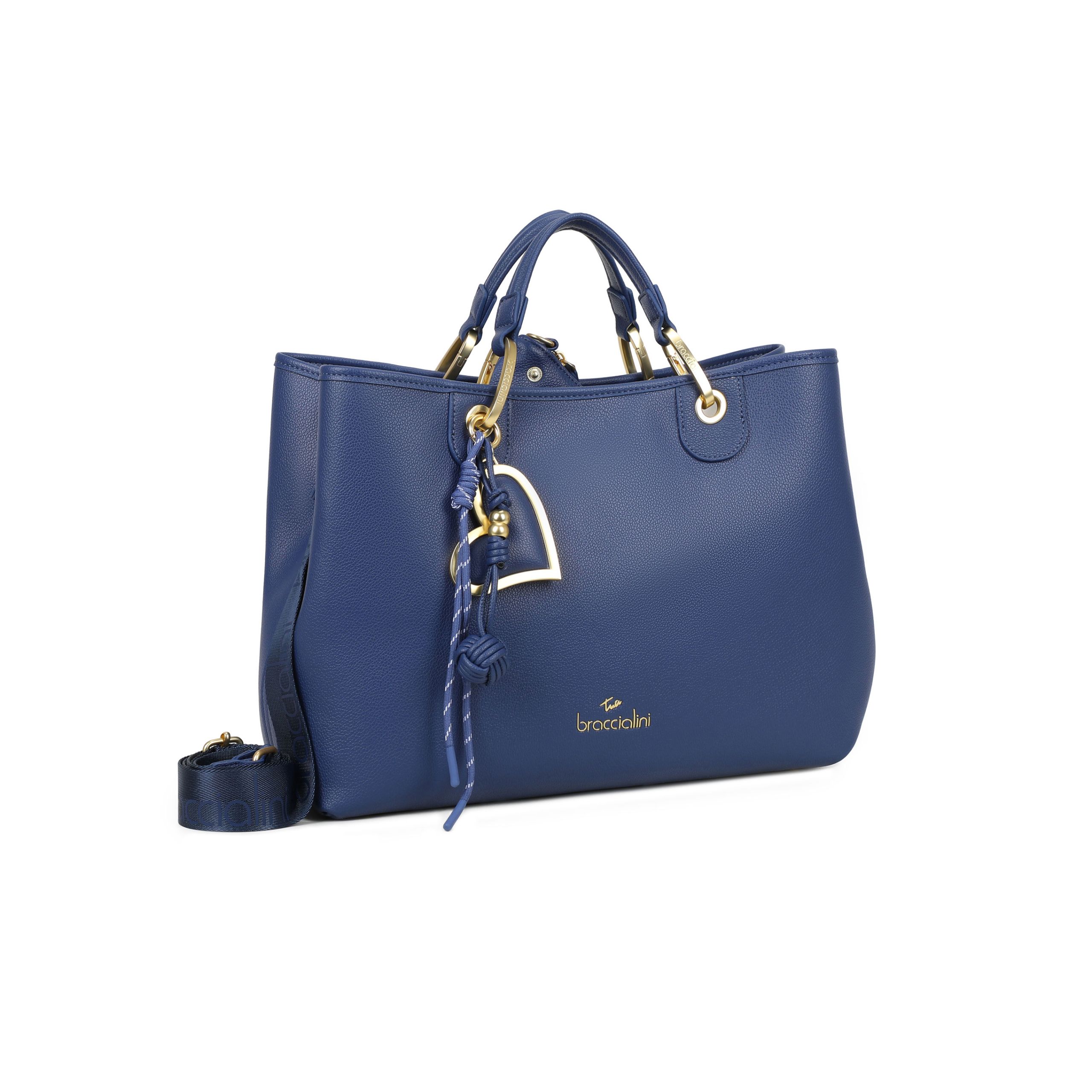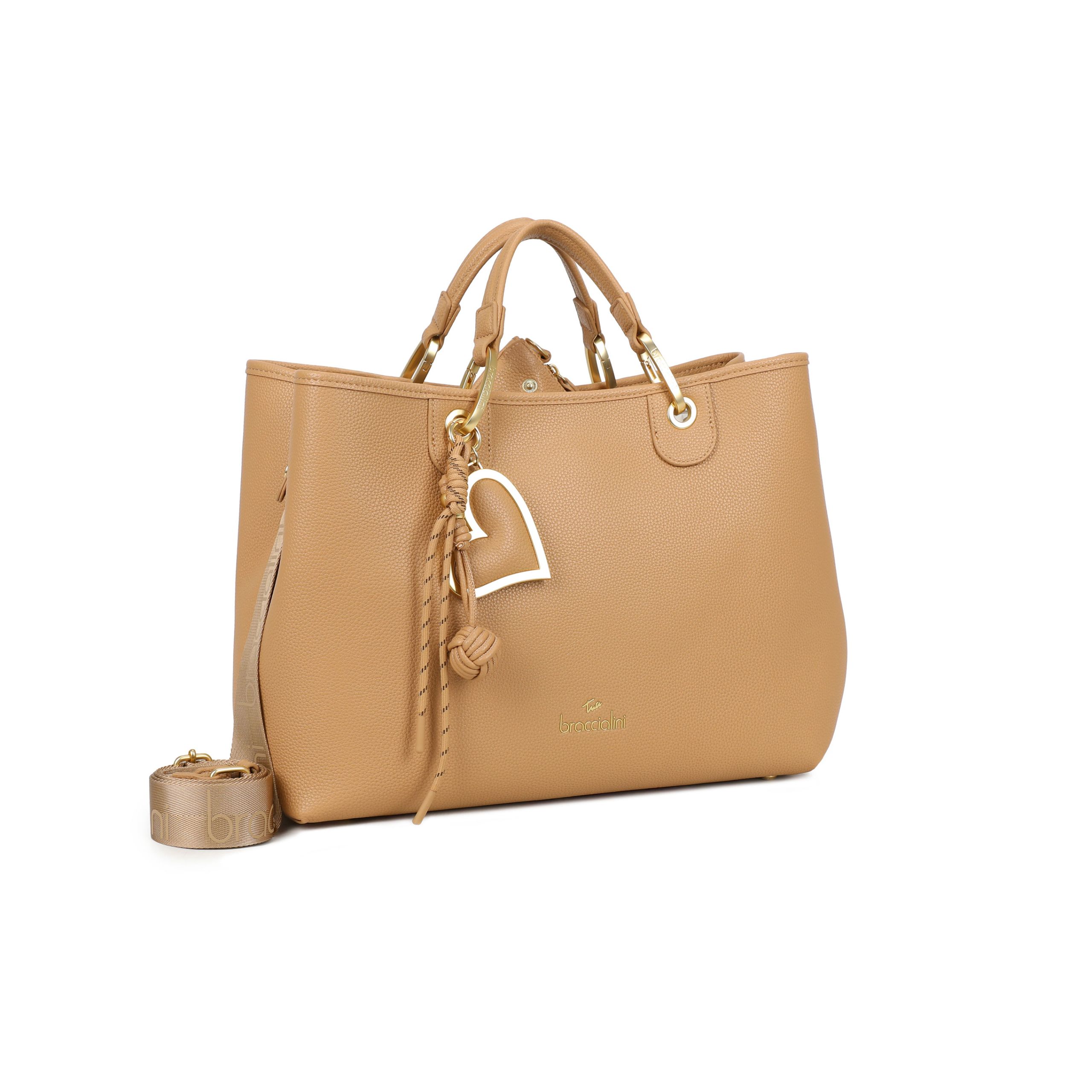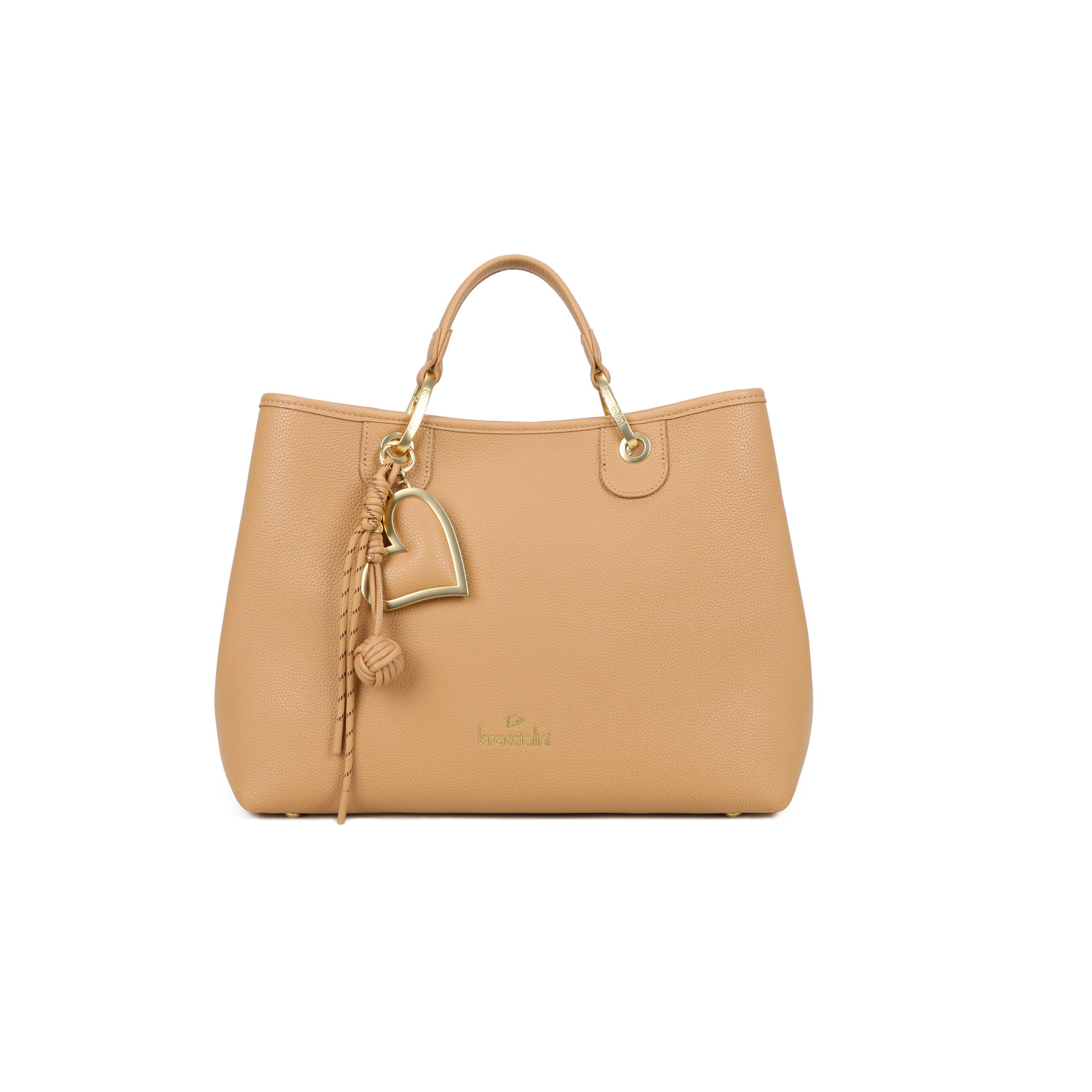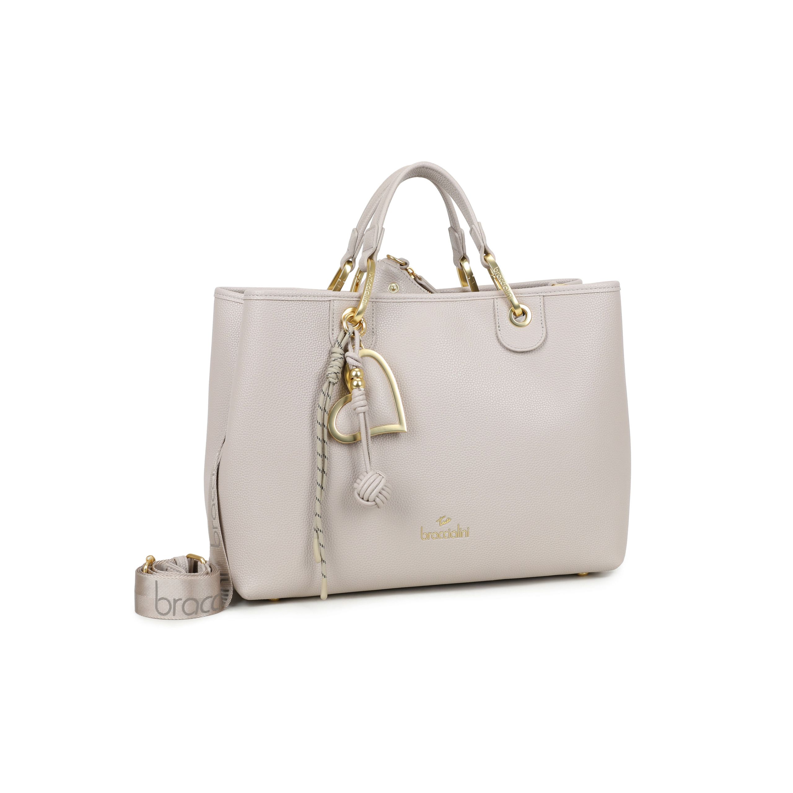 Borsa a mano di grandi dimensioni, con doppi manici e tracolla loggata removibile e regolabile per una doppia portabilità. All’interno, una pochette estraibile utilizzabile come seconda borsa. La linea Beth si caratterizza per il nuovo maxi-charm multifilo con cuore in metallo oro satinato, coordinato alla borsa e removibile.