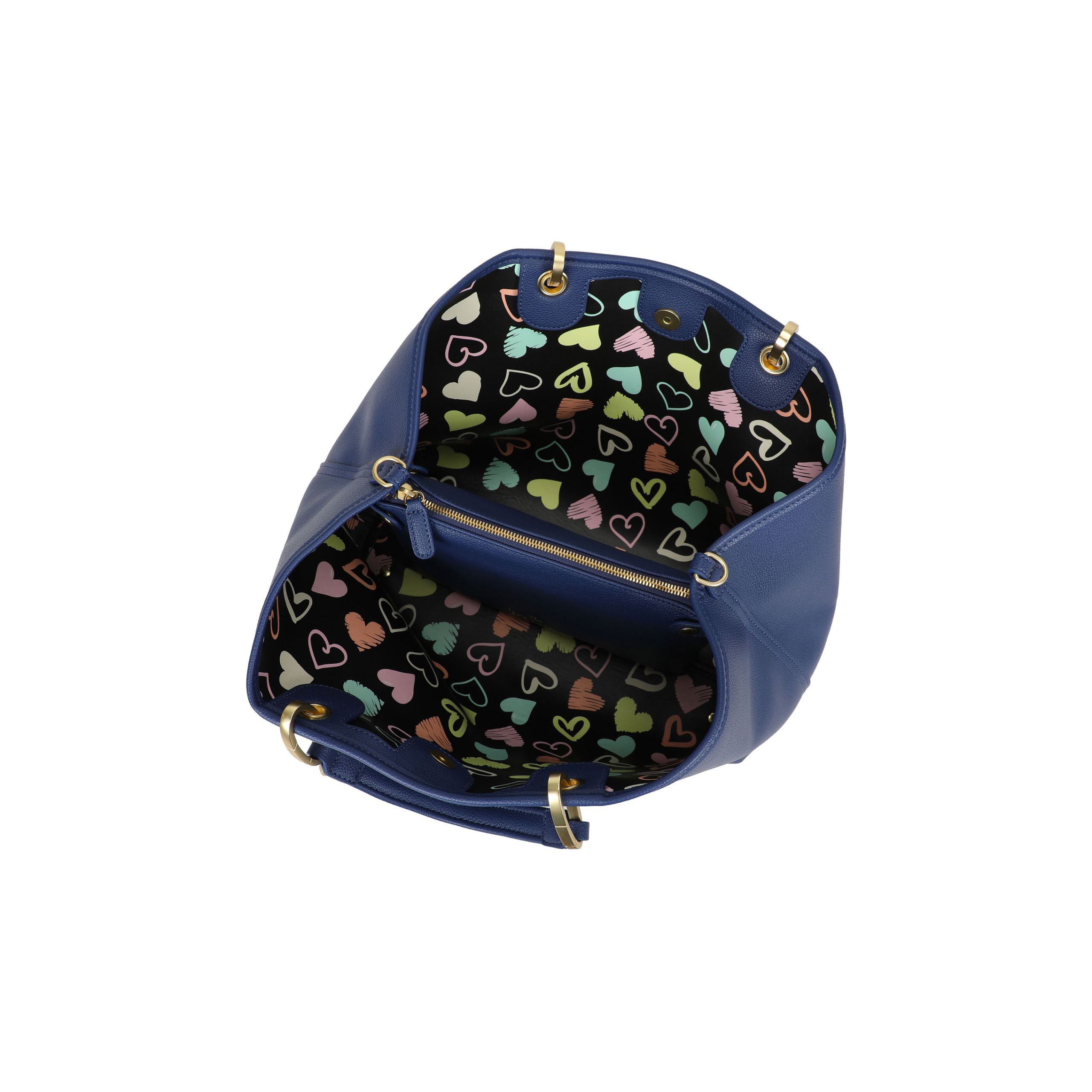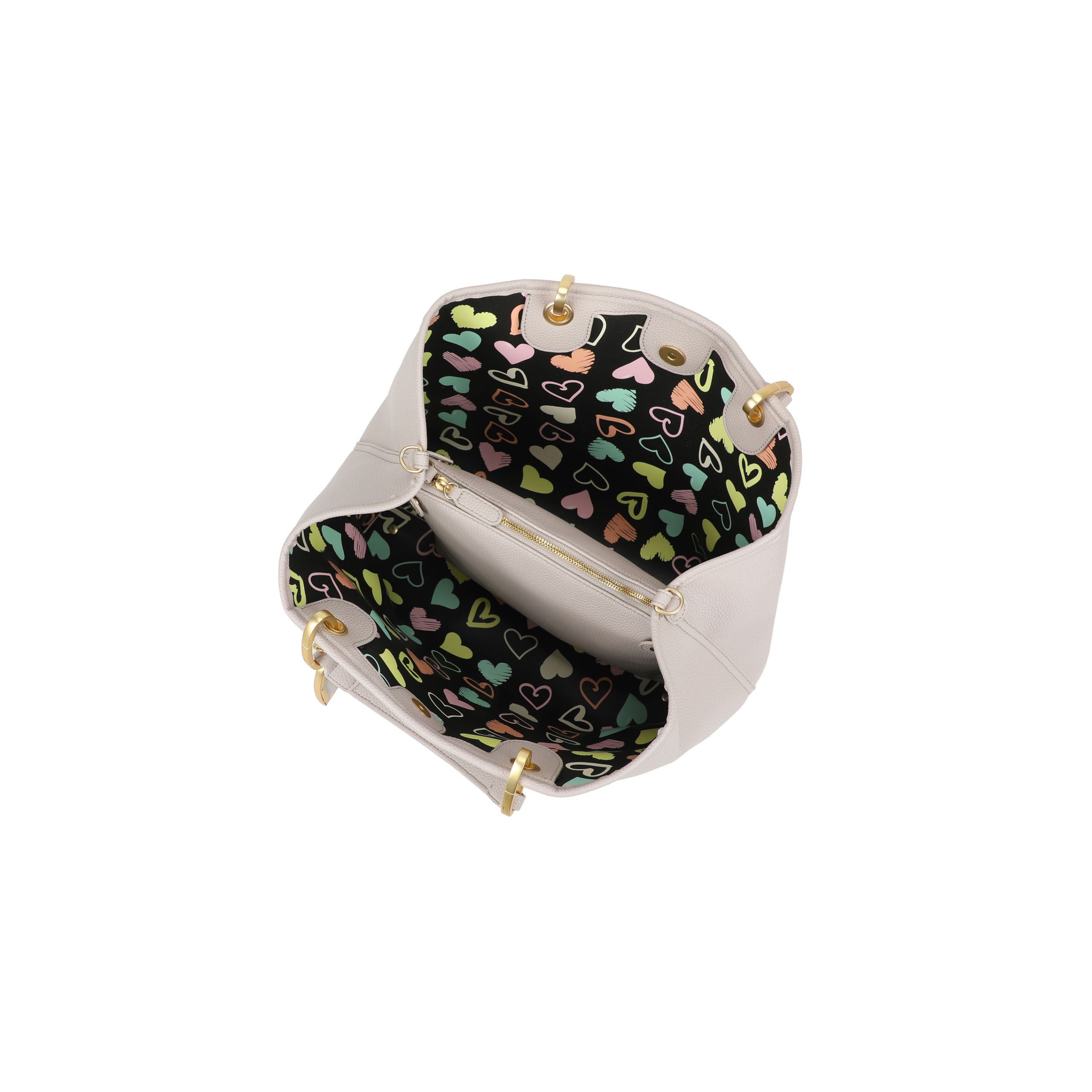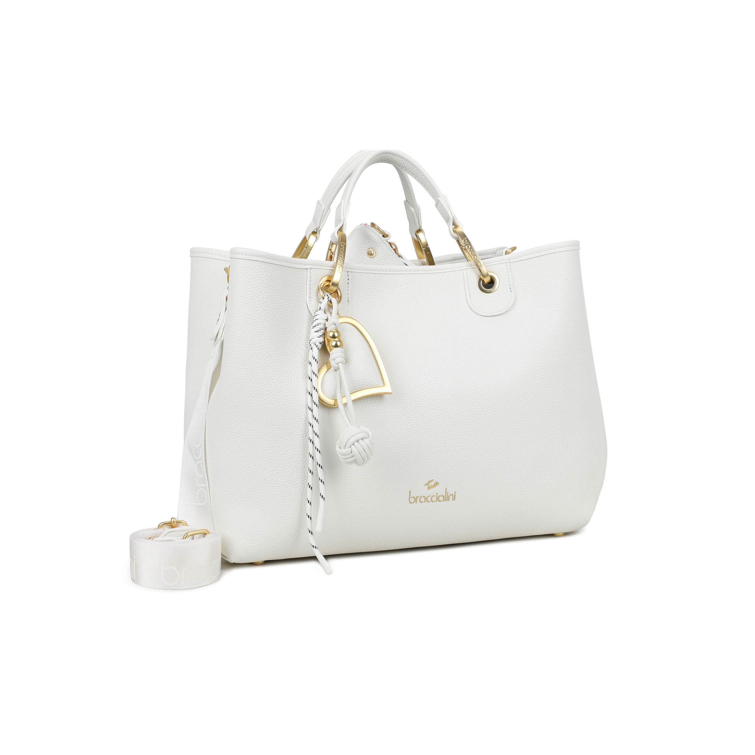 Borsa a mano di grandi dimensioni, con doppi manici e tracolla loggata removibile e regolabile per una doppia portabilità. All’interno, una pochette estraibile utilizzabile come seconda borsa. La linea Beth si caratterizza per il nuovo maxi-charm multifilo con cuore in metallo oro satinato, coordinato alla borsa e removibile.