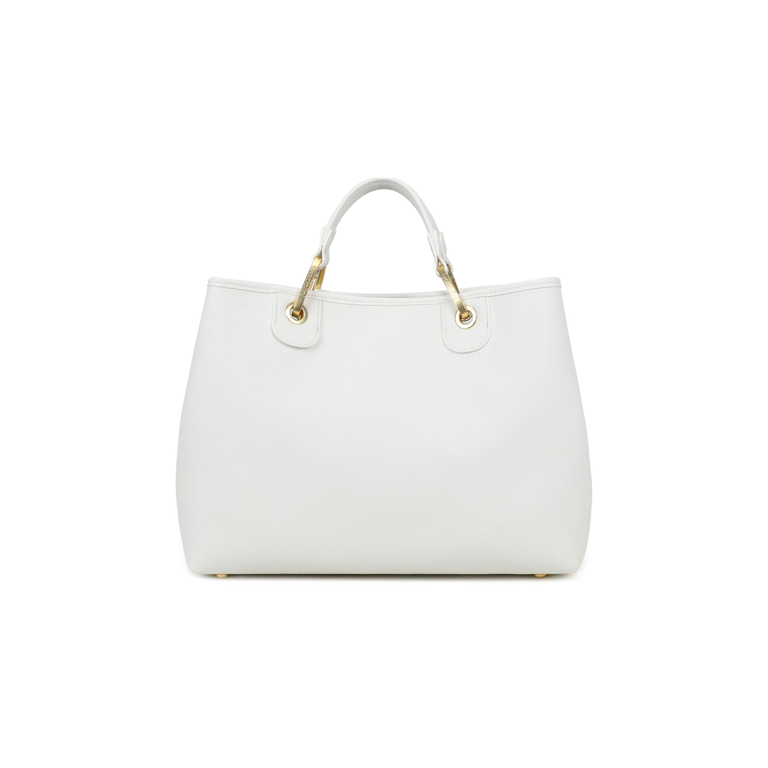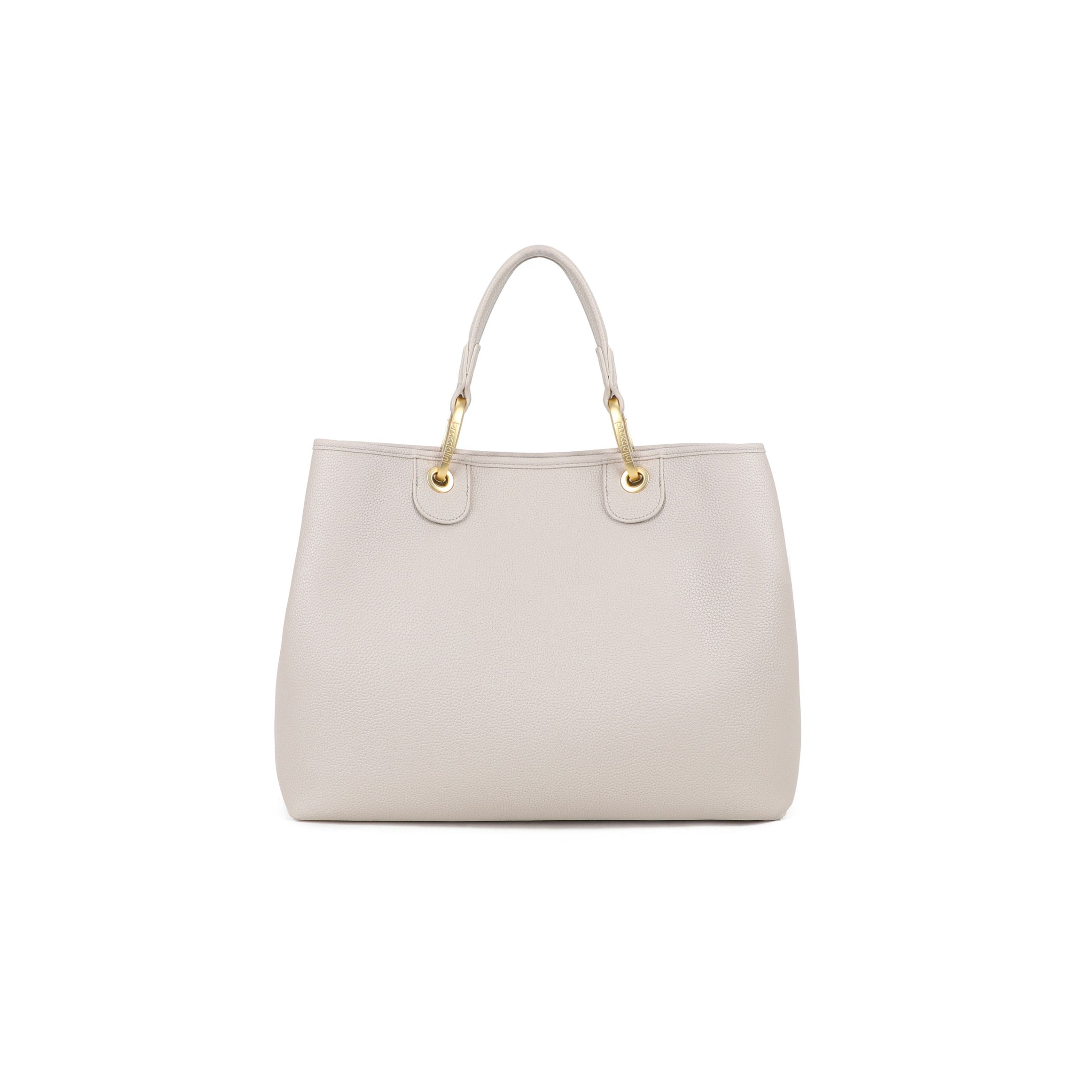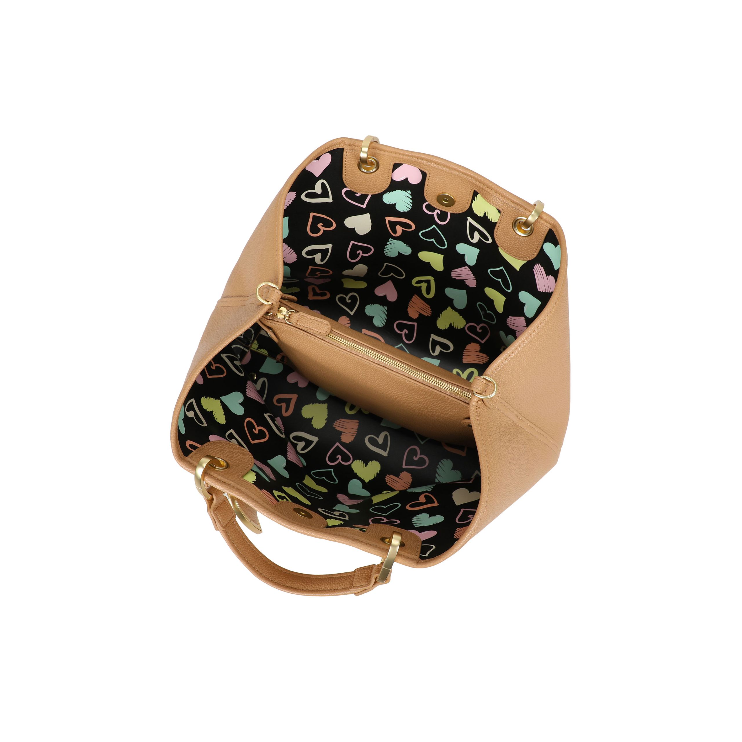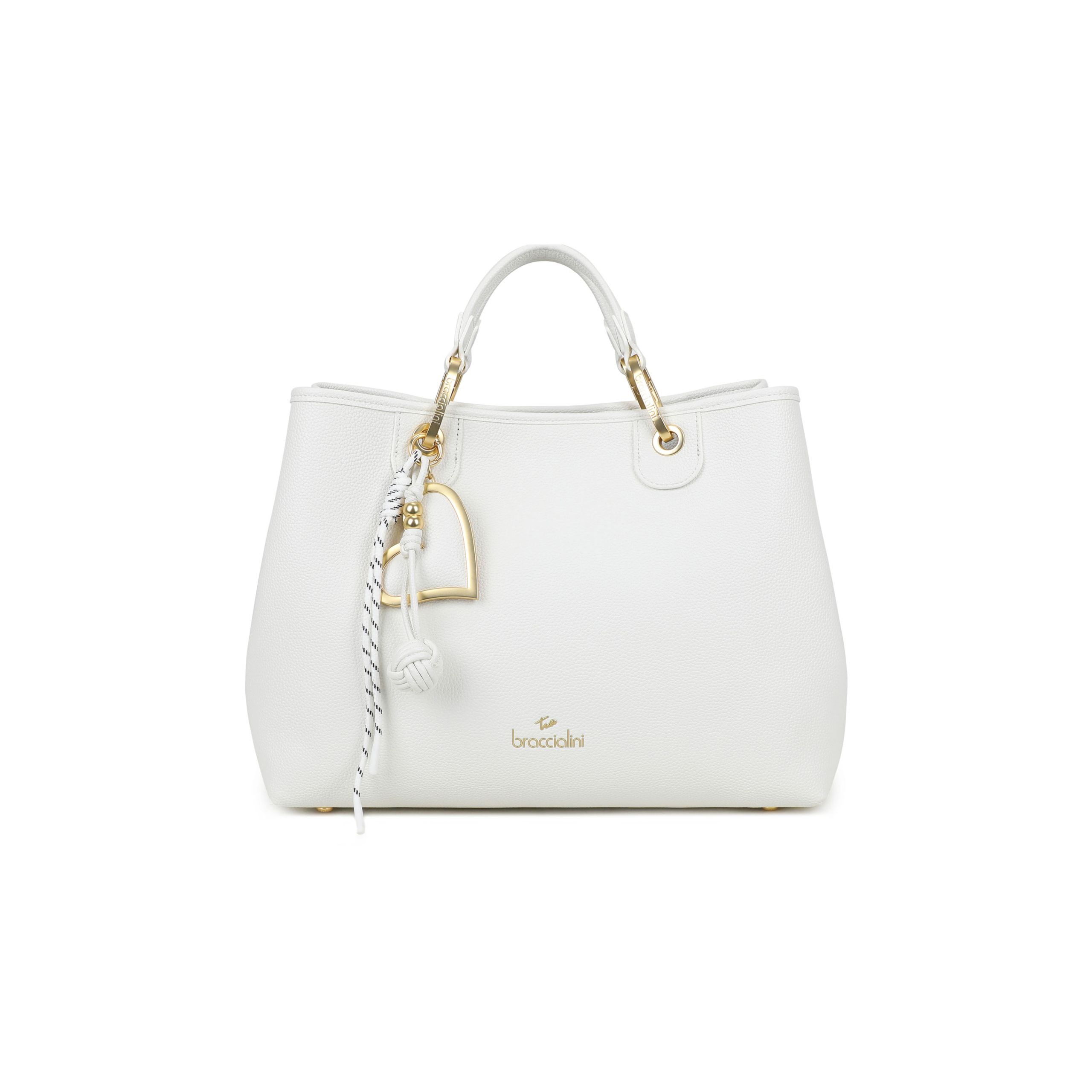 Borsa a mano di grandi dimensioni, con doppi manici e tracolla loggata removibile e regolabile per una doppia portabilità. All’interno, una pochette estraibile utilizzabile come seconda borsa. La linea Beth si caratterizza per il nuovo maxi-charm multifilo con cuore in metallo oro satinato, coordinato alla borsa e removibile.