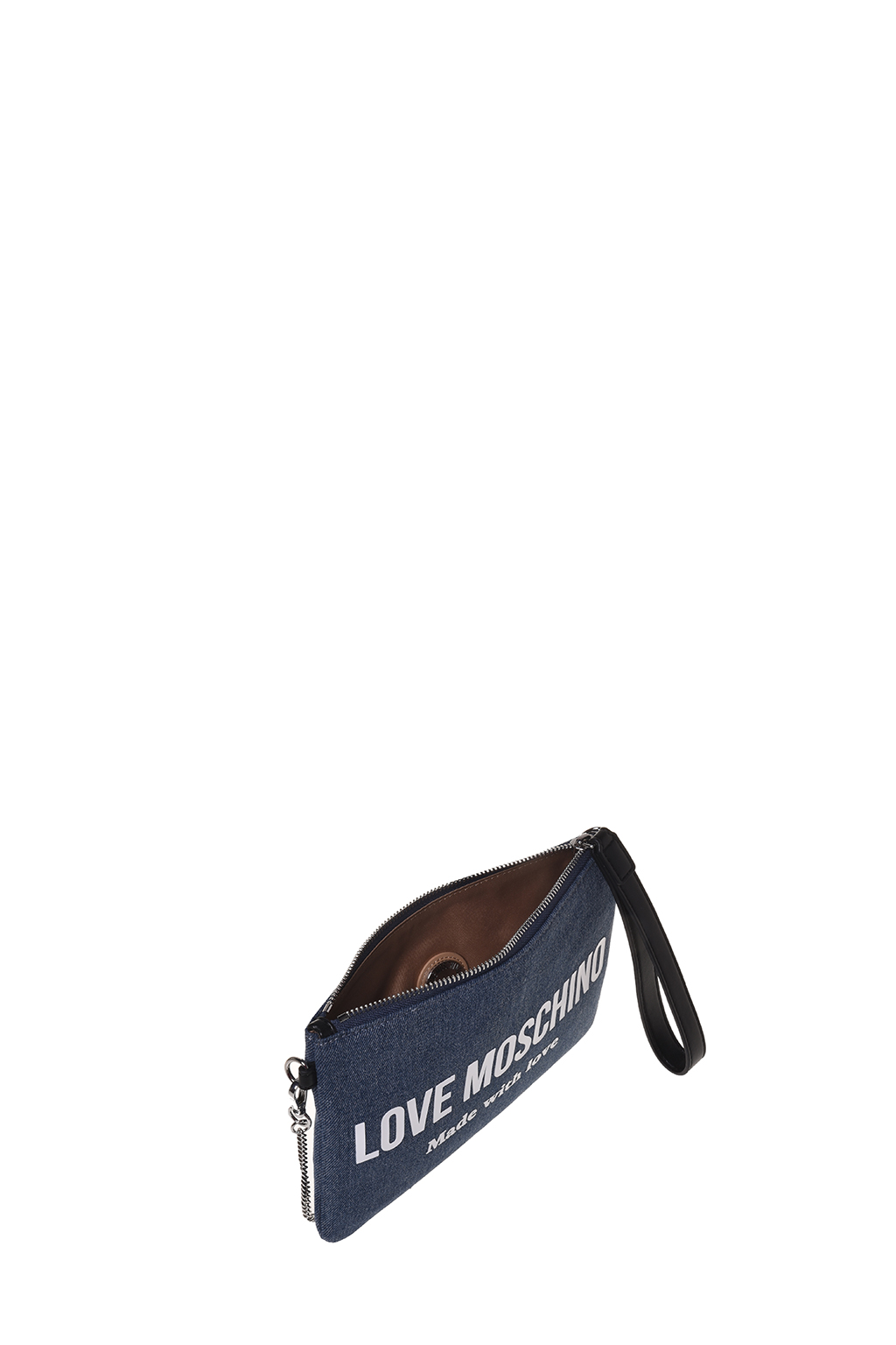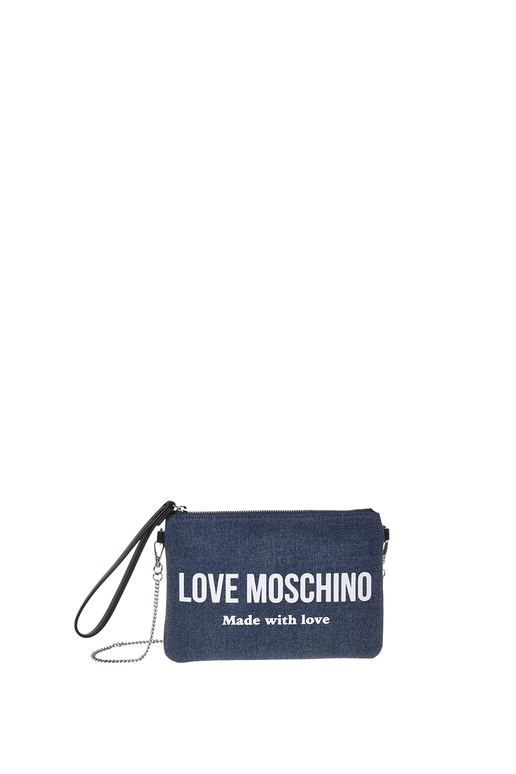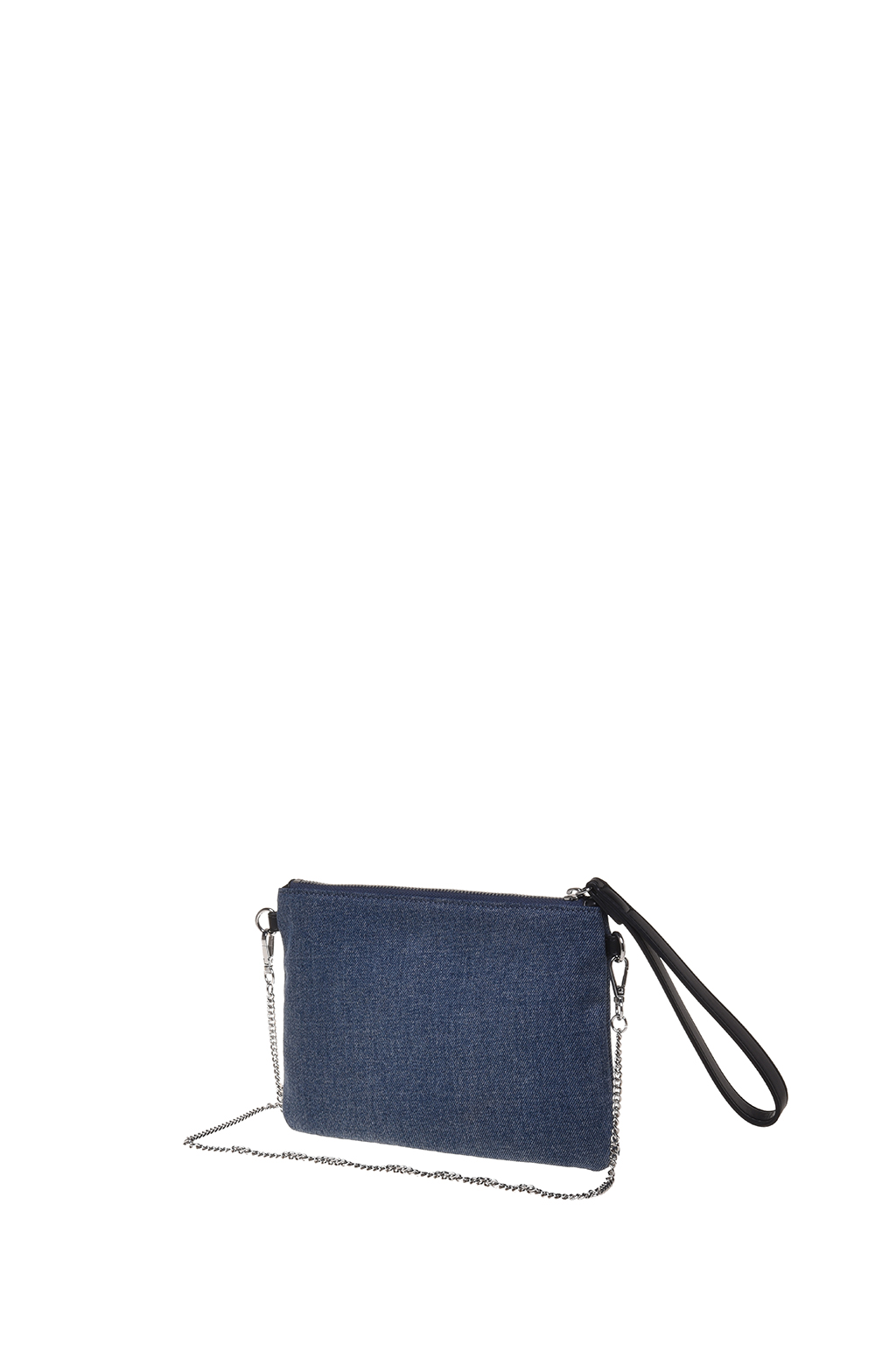 Pochette in denim caratterizzata da una polsiera in ecopelle e tracolla in catena removibile che ne garantisce la doppia portabilità.