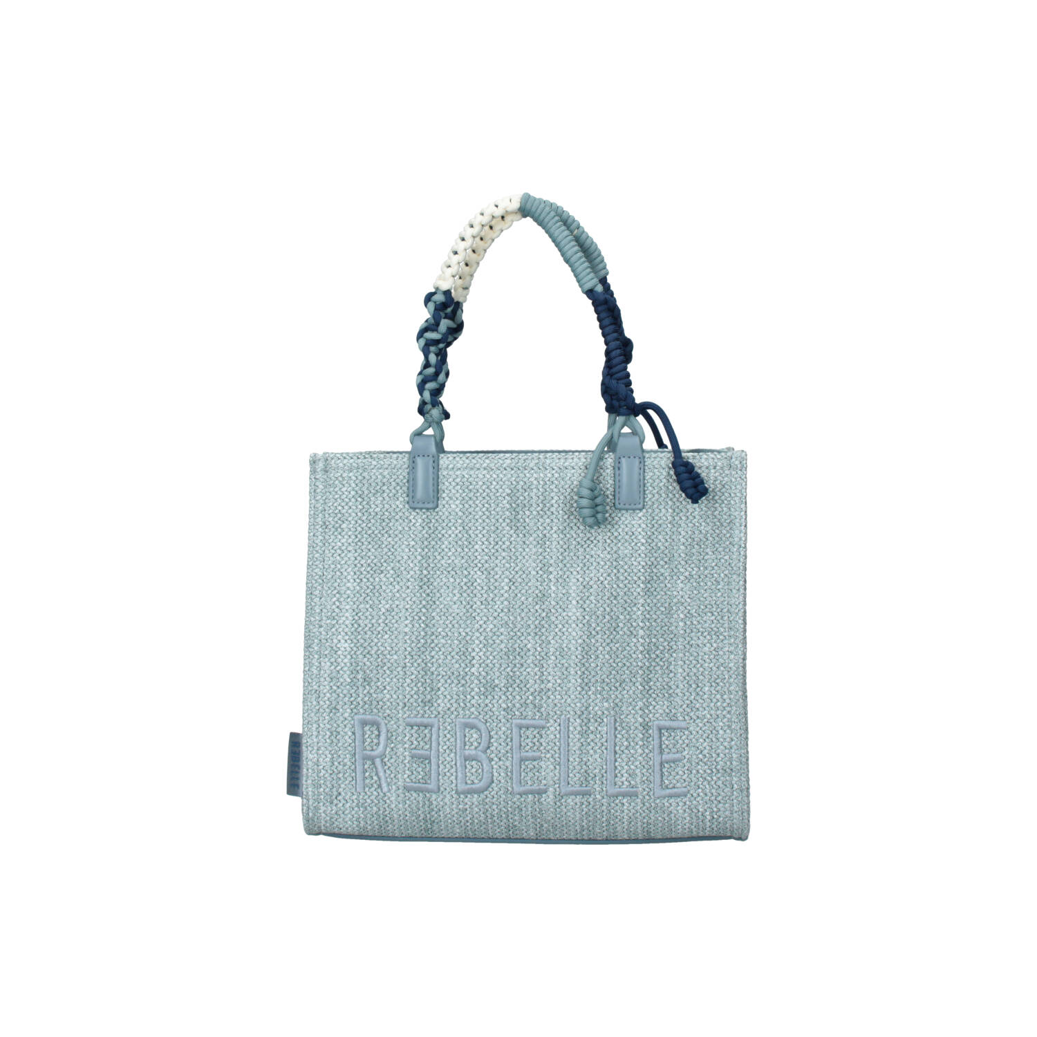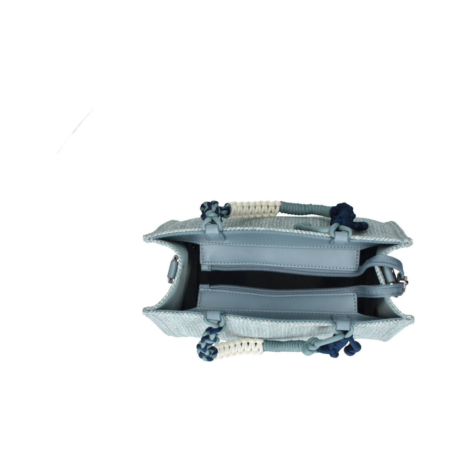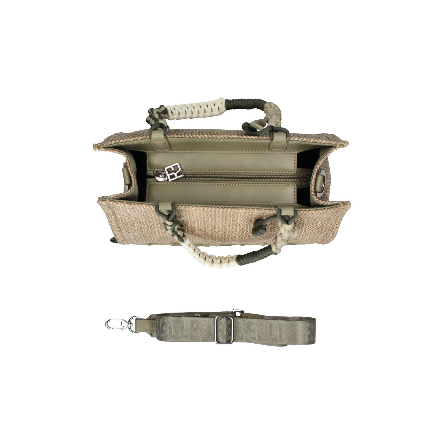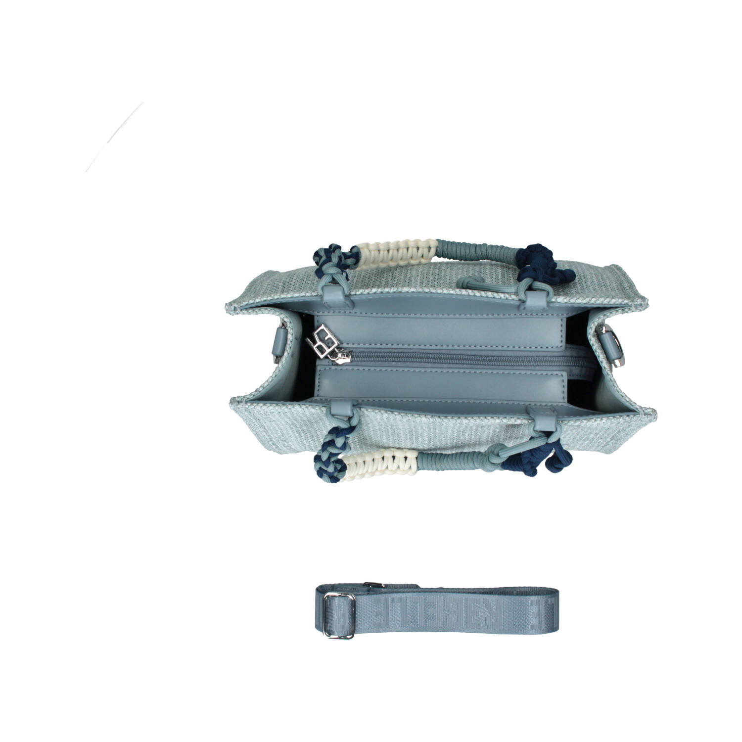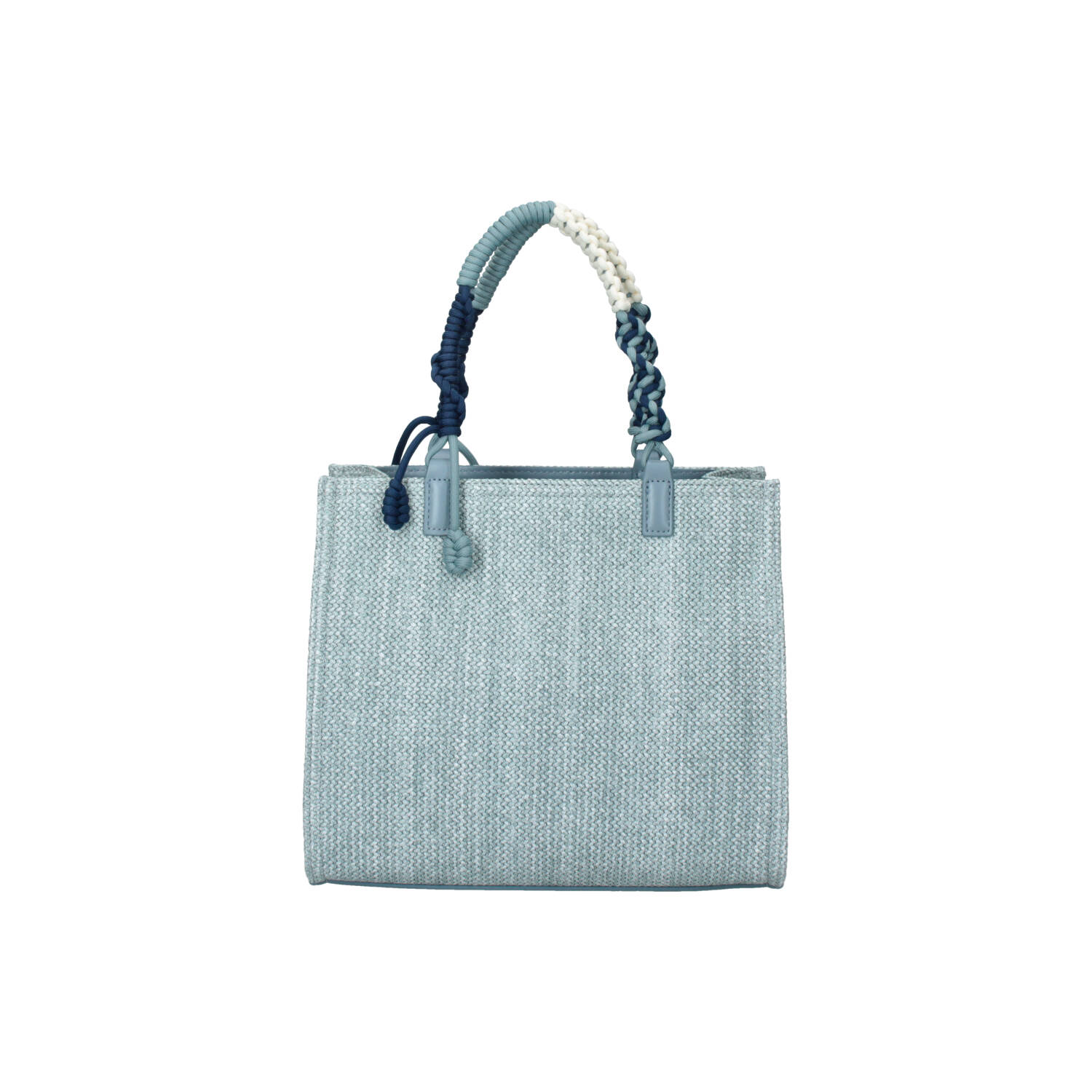 Shopping bag dalla struttura geometrica realizzata in tessuto con logo centrale in rilievo, si distingue per il manico in corda intrecciata bicolore, è dotata di una tracolla regolabile e removibile che ne garantisce la doppia portabilità.