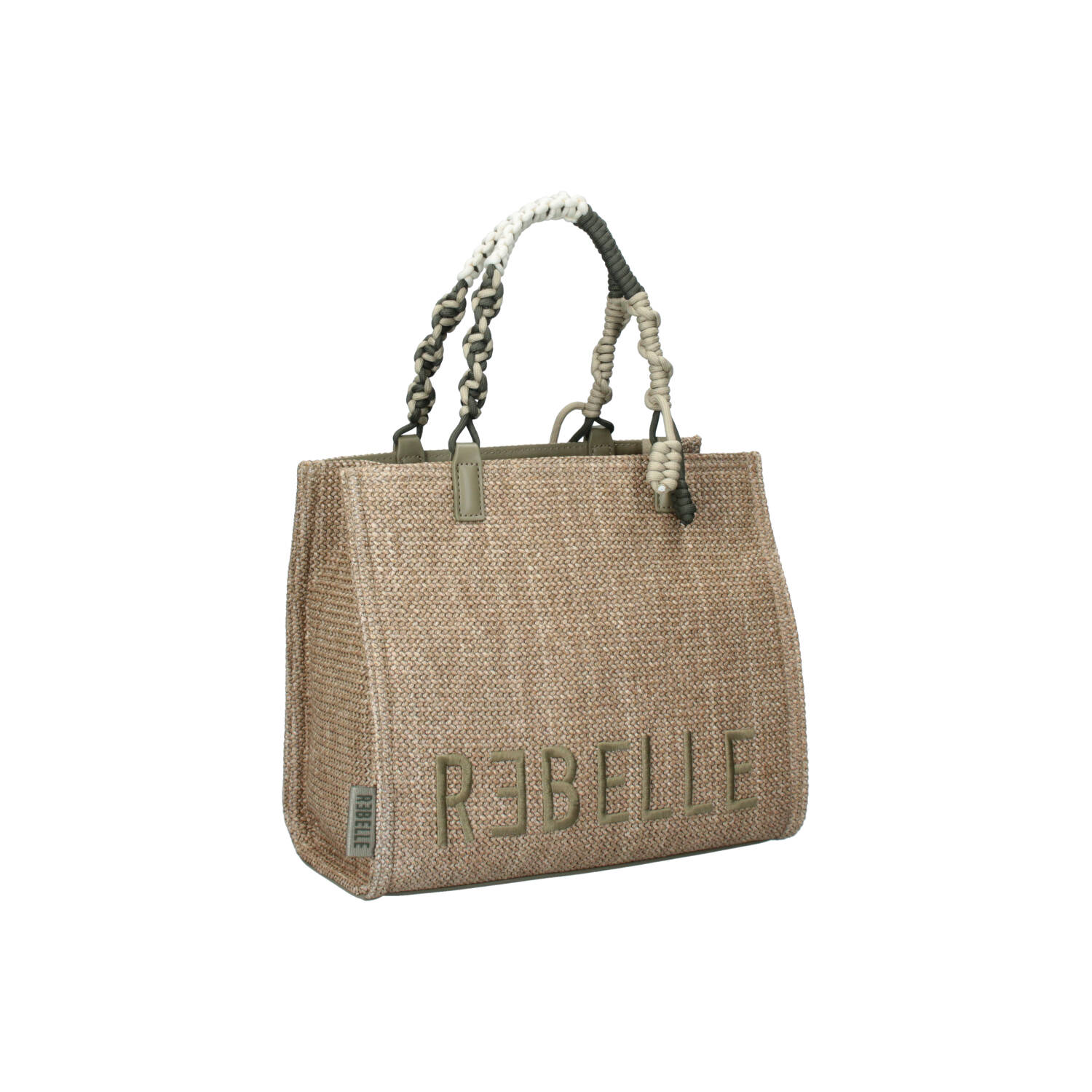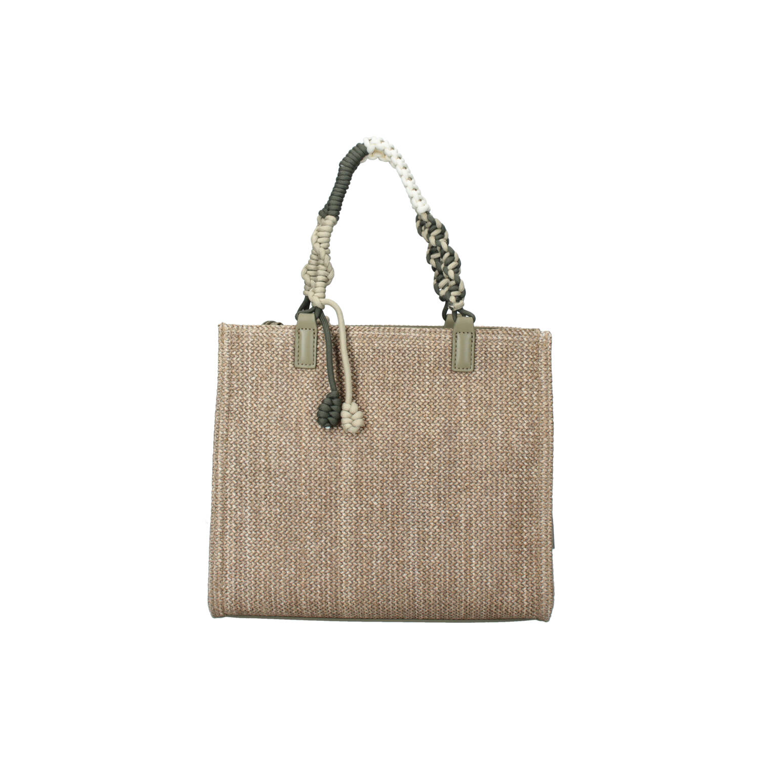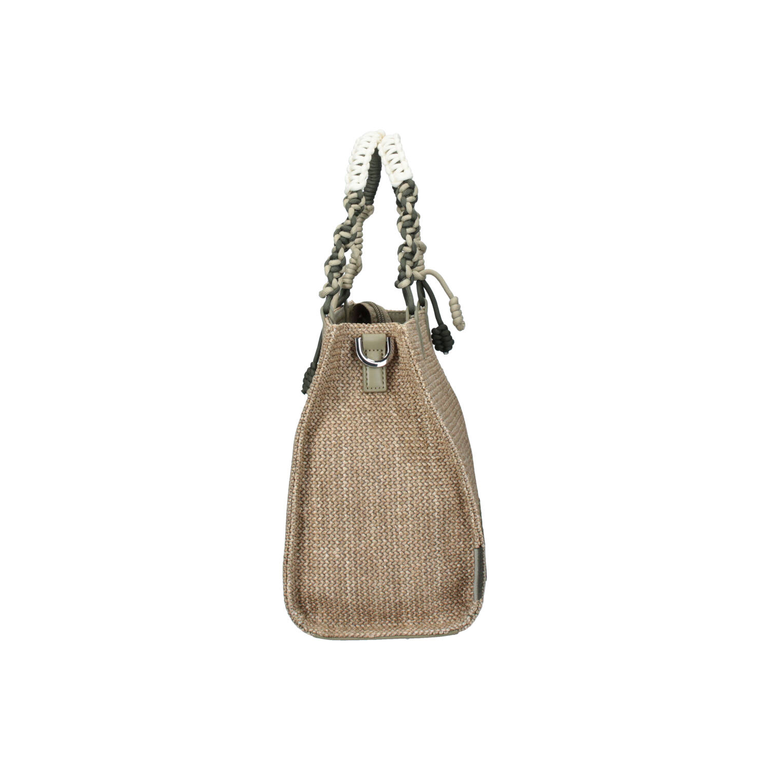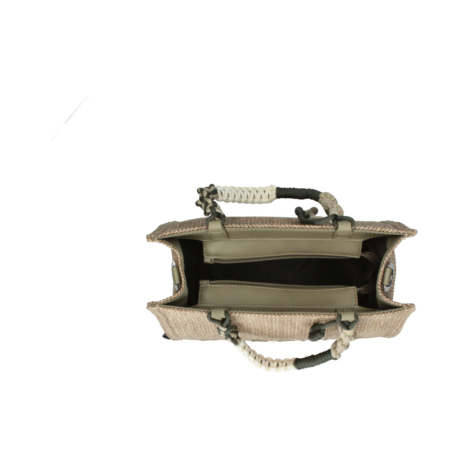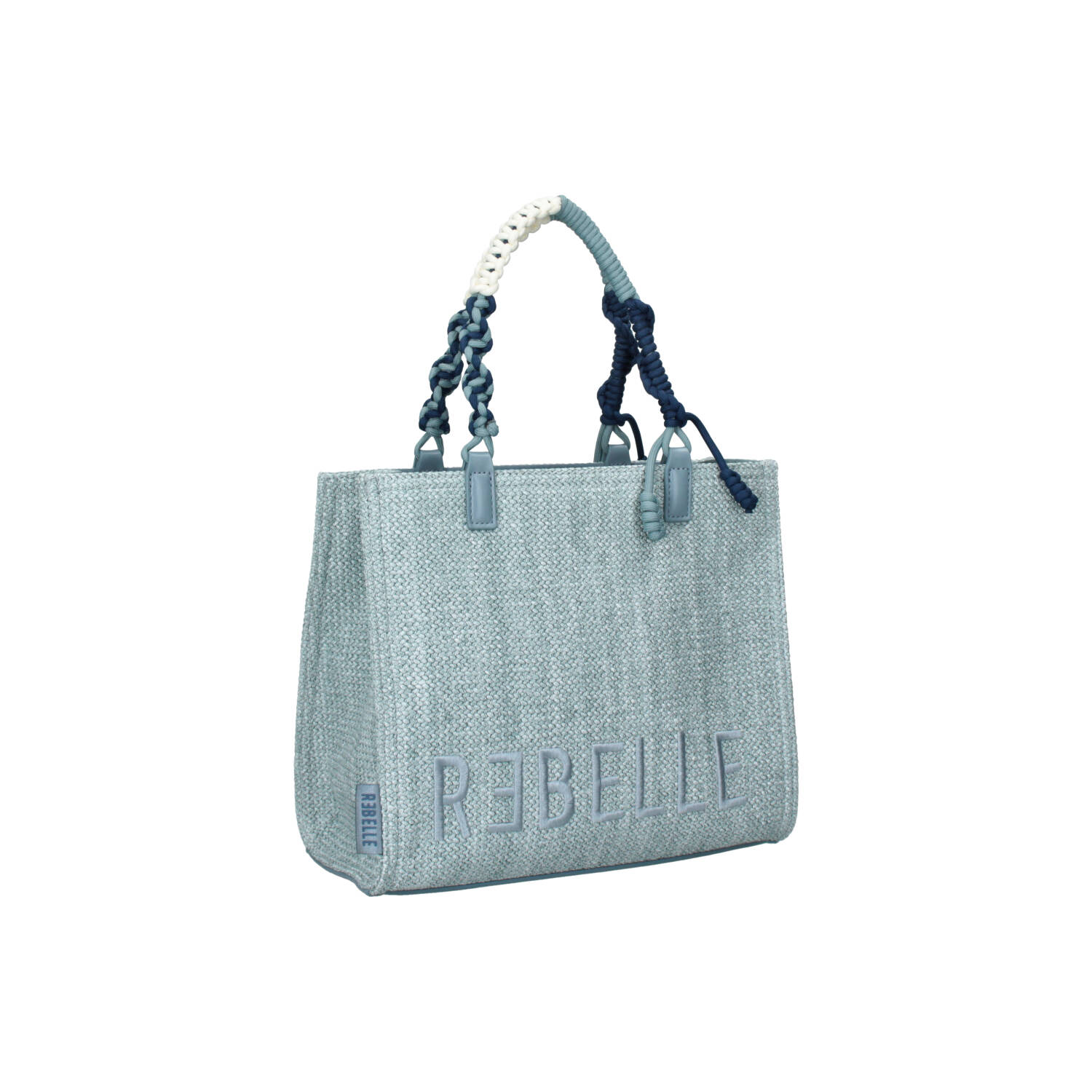 Shopping bag dalla struttura geometrica realizzata in tessuto con logo centrale in rilievo, si distingue per il manico in corda intrecciata bicolore, è dotata di una tracolla regolabile e removibile che ne garantisce la doppia portabilità.