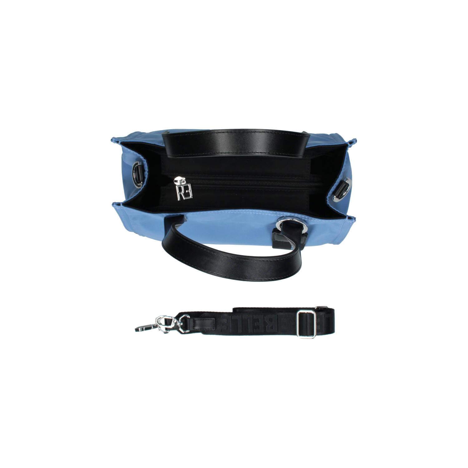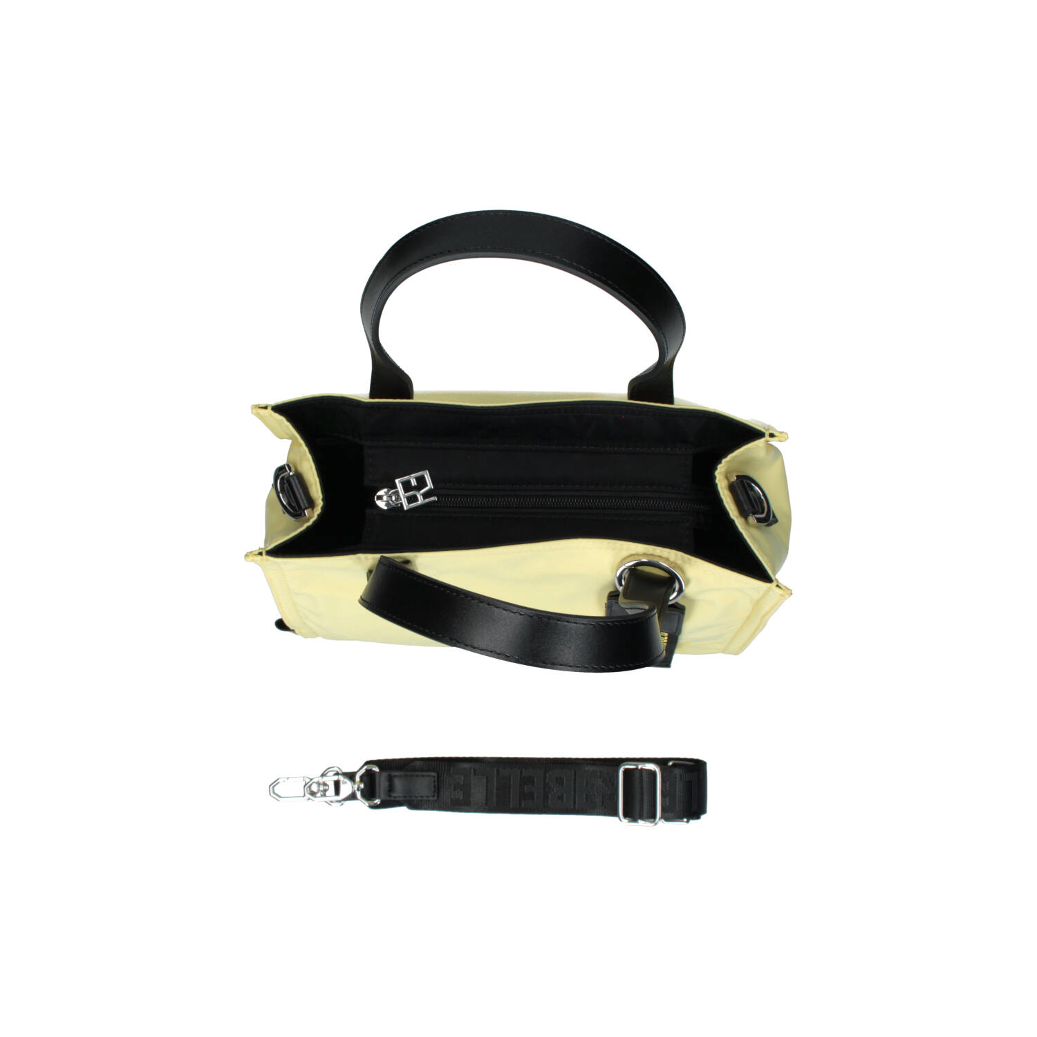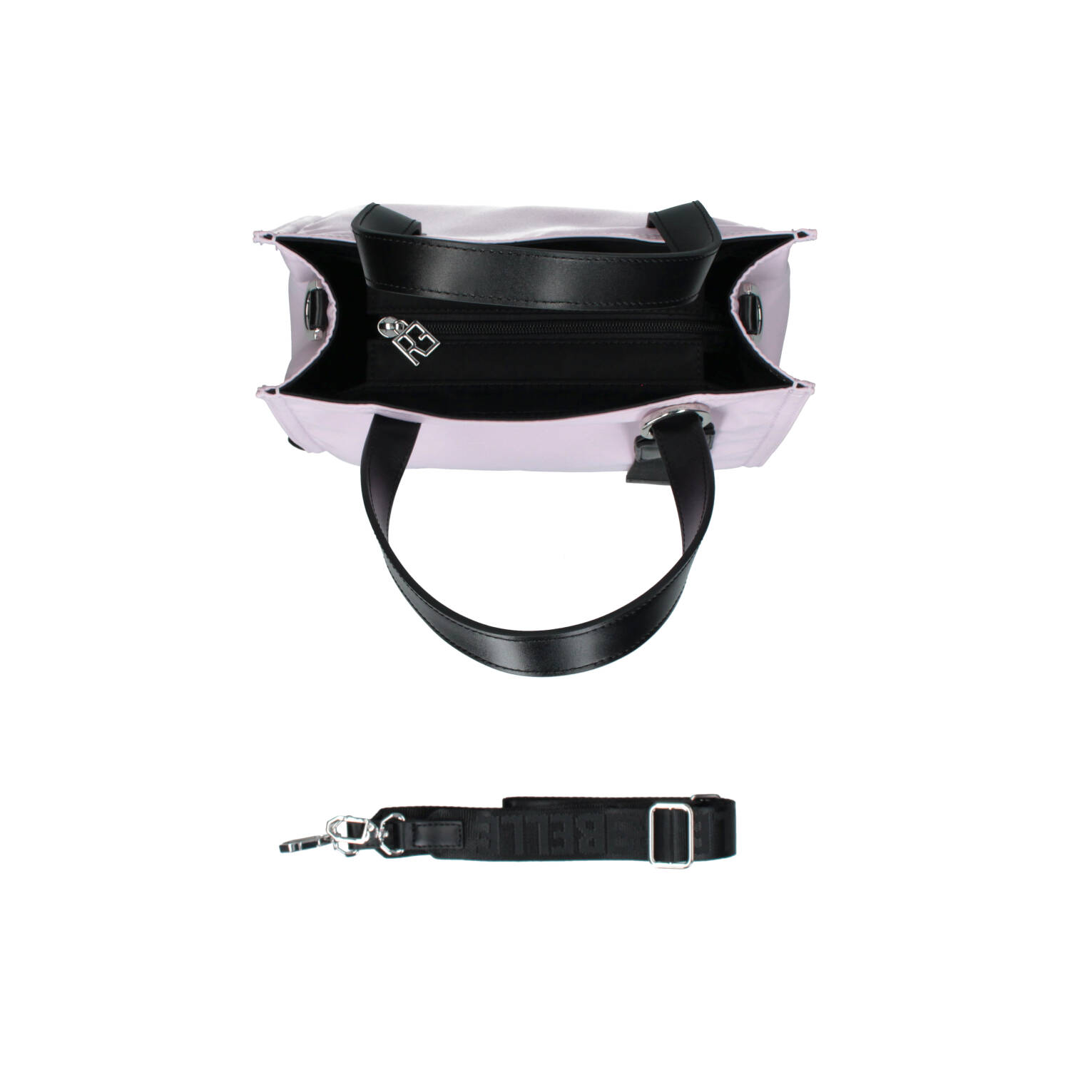Tote bag in nylon con due manici corti in pelle, e tracolla removibile e regolabile, per una doppia portabilità. La borsa si chiude con una zip, è foderata internamente e presenta piccole tasche per riporre piccoli oggetti.