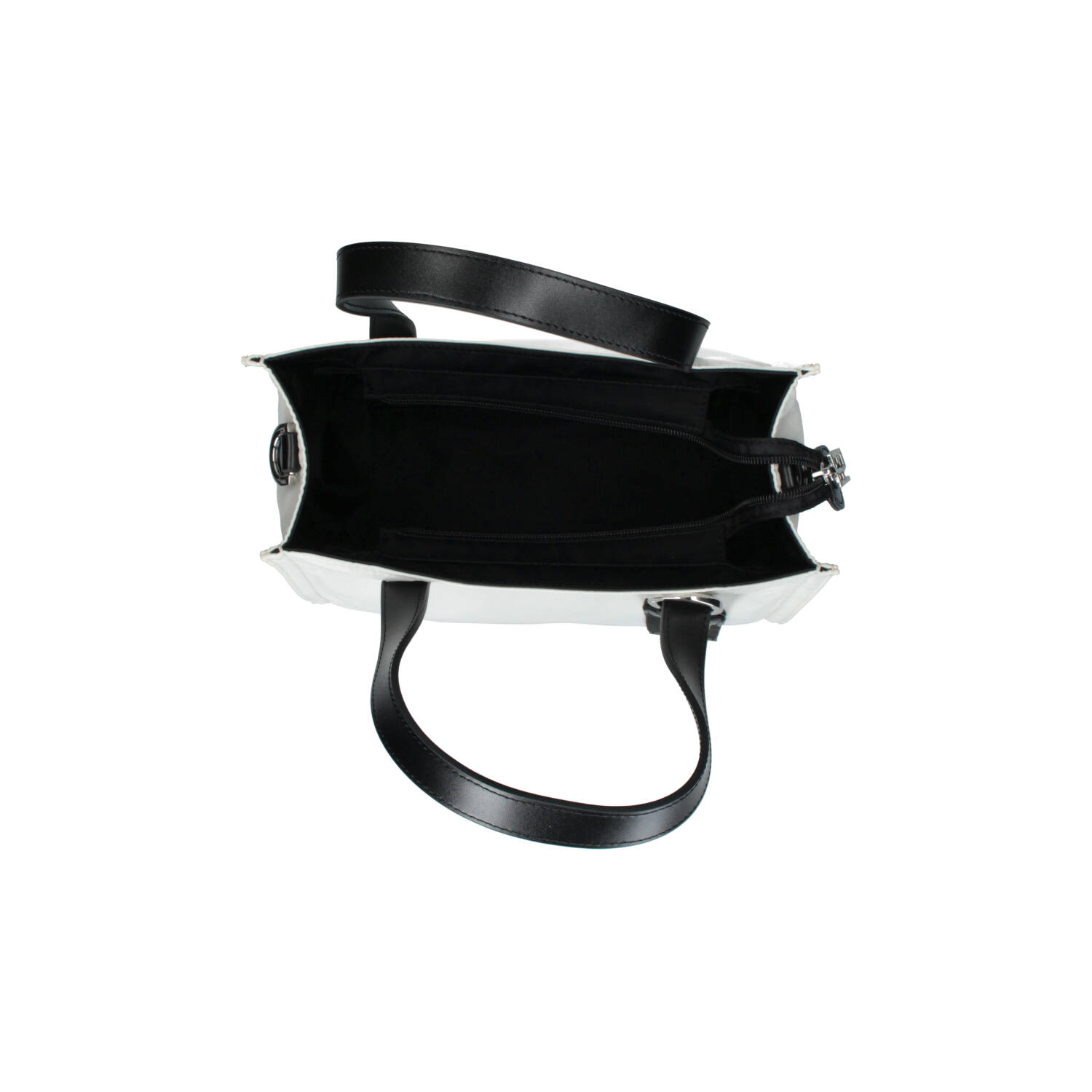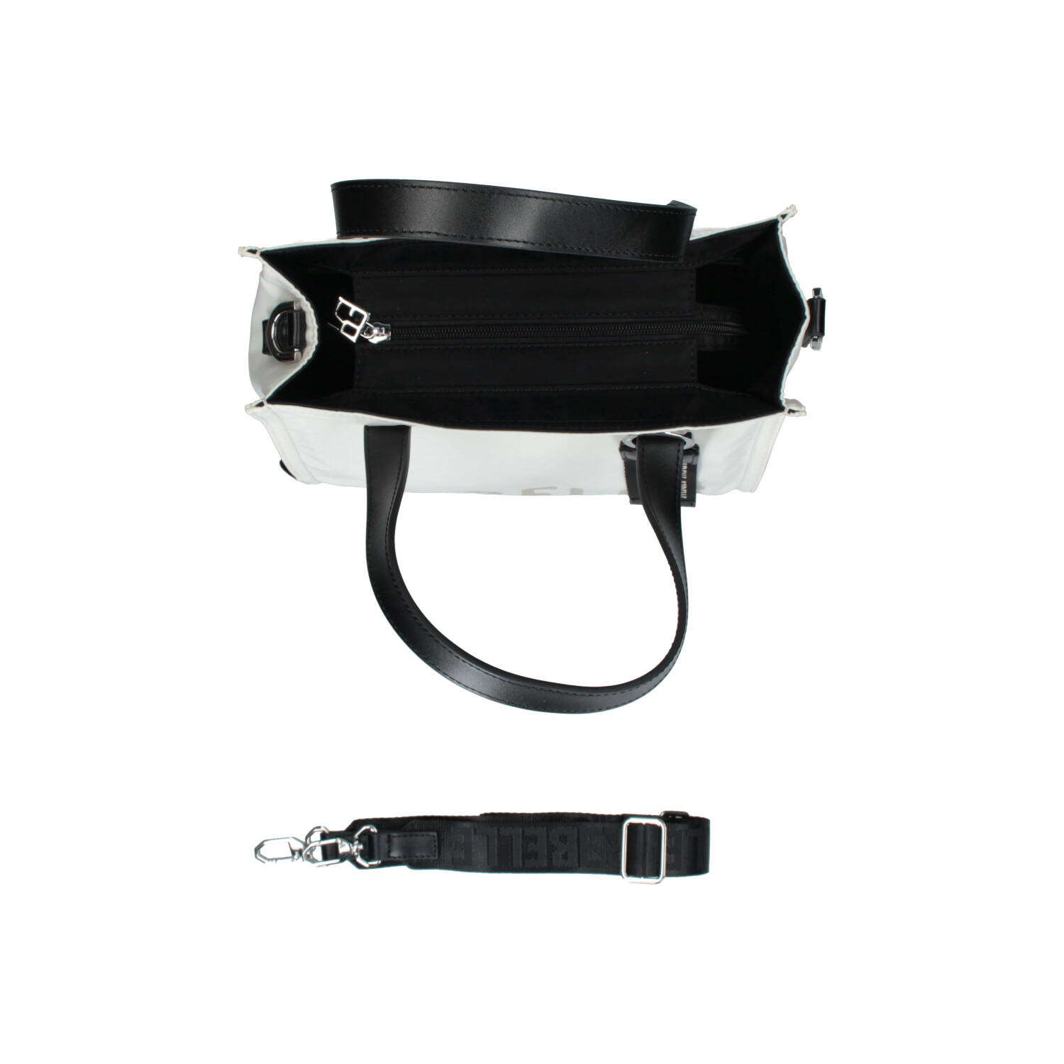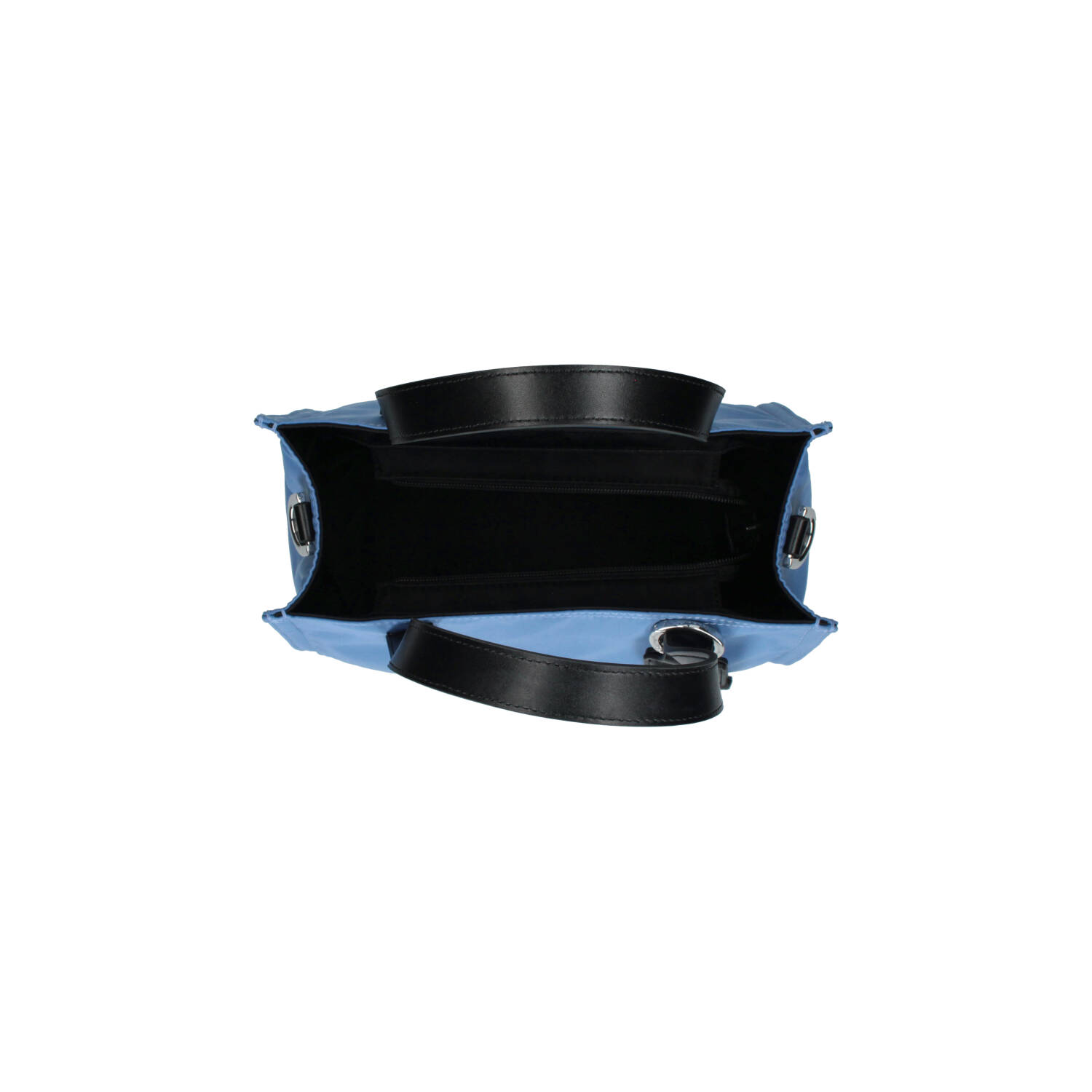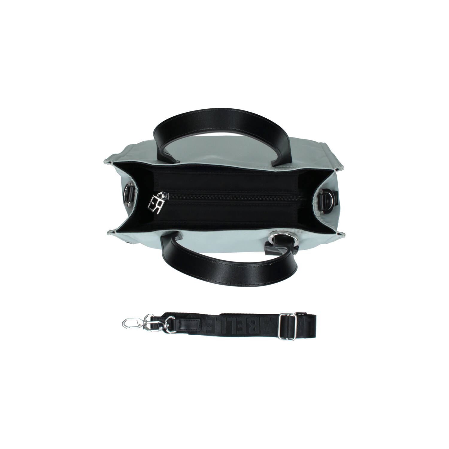 Tote bag in nylon con due manici corti in pelle, e tracolla removibile e regolabile, per una doppia portabilità. La borsa si chiude con una zip, è foderata internamente e presenta piccole tasche per riporre piccoli oggetti.